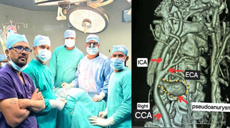 गर्दन के नसों की सीटी एंजियोग्राफी जांच में यह चौंकाने वाला तथ्य सामने आया कि मरीज की दायीं कैरोटिड आर्टरी फट चुकी है और उसके चारों ओर गुब्बारानुमा संरचना बन गई है, जिसे कैरोटिड आर्टरी स्यूडोएन्युरिज्म (Carotid Artery Pseudoaneurysm) कहा जाता है। स्थिति की गंभीरता को देखते हुए मरीज को तत्काल हार्ट, चेस्ट एवं वैस्कुलर सर्जरी विभाग में में डॉ कृष्ण कांत साहू के पास भेजा गया।
