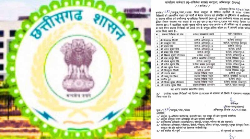 इस तरह धर्मेन्द्र कुमार सिंह का रा.नि.मं. सलका (लखनपुर) से रा.नि.मं. अम्बिकापुर-6, छय कुमार पैंकरा का रा.नि.मं. पेटला सीतापुर से राजस्व निरीक्षक नजूल, शिवपूजन तिवारी का रा.नि.मं. बतौली से राजस्व निरीक्षक नजूल, रामदेव यादव का राजस्व निरीक्षक नजूल से रा.नि.मं. लुण्ड्रा, सरयू राम पैंकरा का राजस्व निरीक्षक नजूल से रा.नि.मंखम्हरिया (उदयपुर), आशीष गुहा का राजस्व निरीक्षक नजूल से रा.नि.मं. धौरपुर, विजय कुमार श्रीवास्तव राजस्व निरीक्षक नजूल से रा.नि.मं. सलका (लखनपुर), सत्येन्द्र कुमार मिश्रा से राजस्व निरीक्षक डायवर्सन का रा.नि.मं. पेटला सीतापुर तबादला किया गया है.